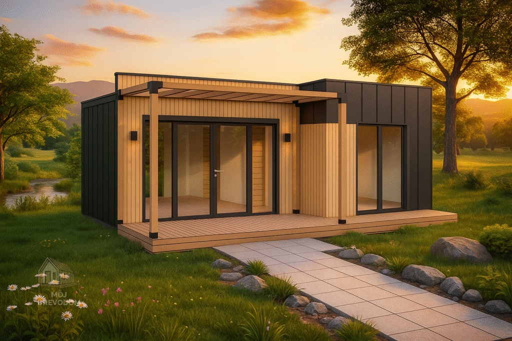 Tento nízky plochý dom s minimálnou výškou stropu 2,2 m bol navrhnutý exkluzívne pre našich klientov, ktorí hľadajú praktické, cenovo dostupné a rýchlo montovateľné riešenie bývania. Vďaka čistému modernému vzhľadu a jednoduchej konštrukcii zapadne do akejkoľvek záhrady, rekreačného pozemku alebo ako prídavný objekt k hlavnému domu. Nie je príliš veľký, no ani stiesnený, ideálny ako víkendový domček, záhradná kancelária, ateliér alebo štartovacie bývanie pre jednotlivca či pár. Plochá strecha s miernym sklonom dotvára elegantný vzhľad a minimalizuje nároky na výšku stavby.